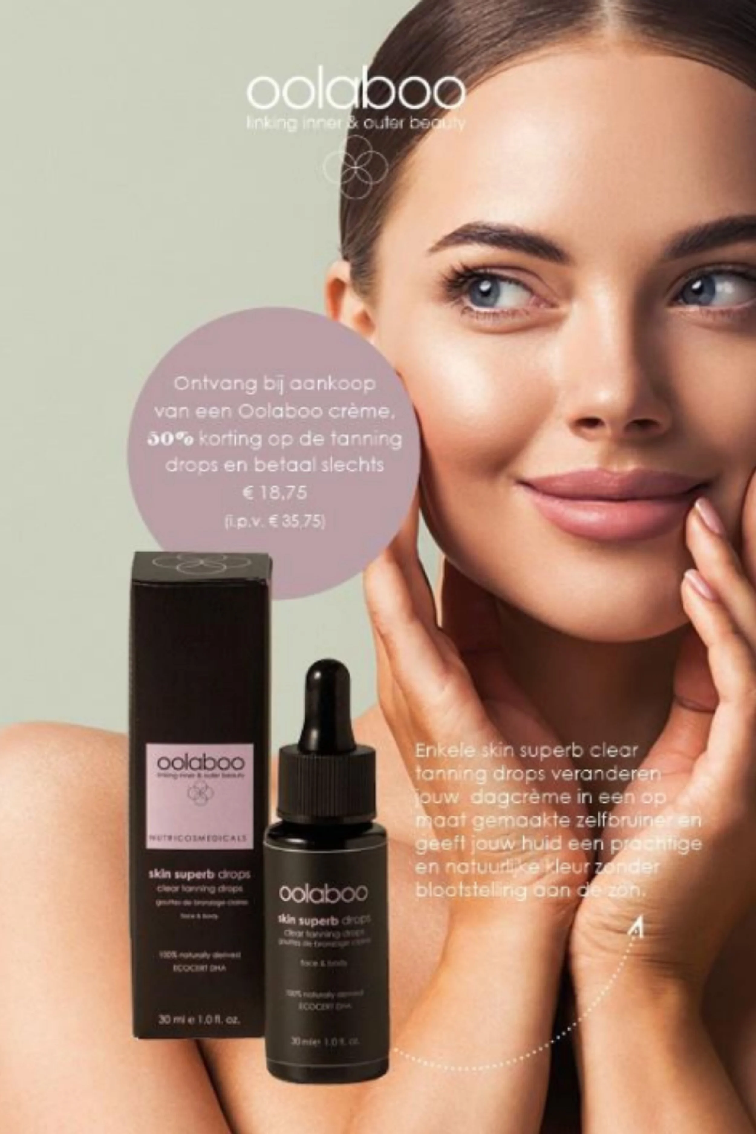 Mix & match alle dag- en nachtcrèmes uit het Oolaboo assortiment en ontvang tot -50% korting op de Skin Superb Clear Tanning Drops.