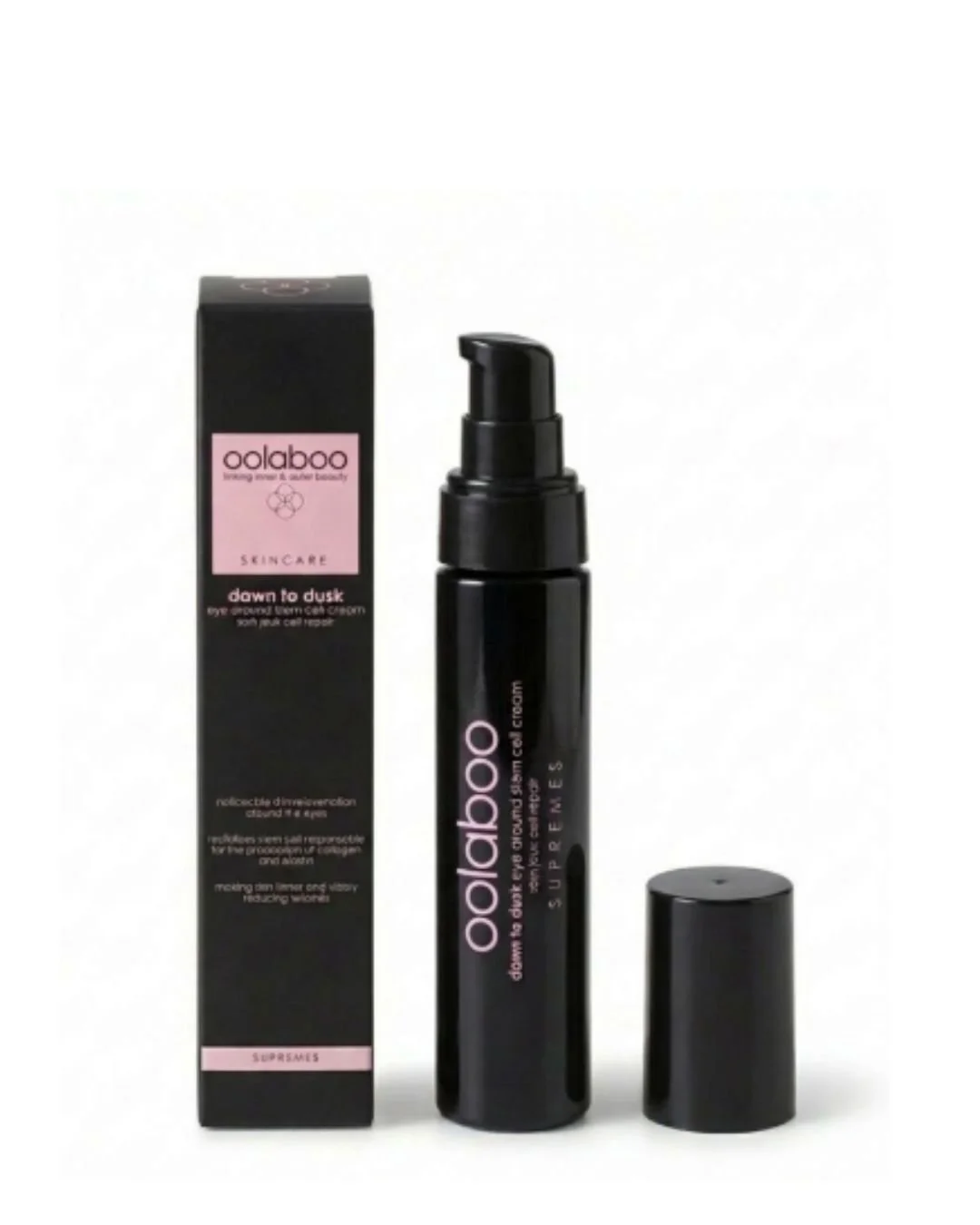Promo op de nieuwe Eye Around Cream van Oolaboo. De formule van onze nieuwe oogcrème zit verpakt in een exclusieve, dieppaarse glazen dispenser, waardoor deze beschermd is tegen schadelijk licht. Het pompje zorgt voor een steriele applicatie bij elk gebruik.